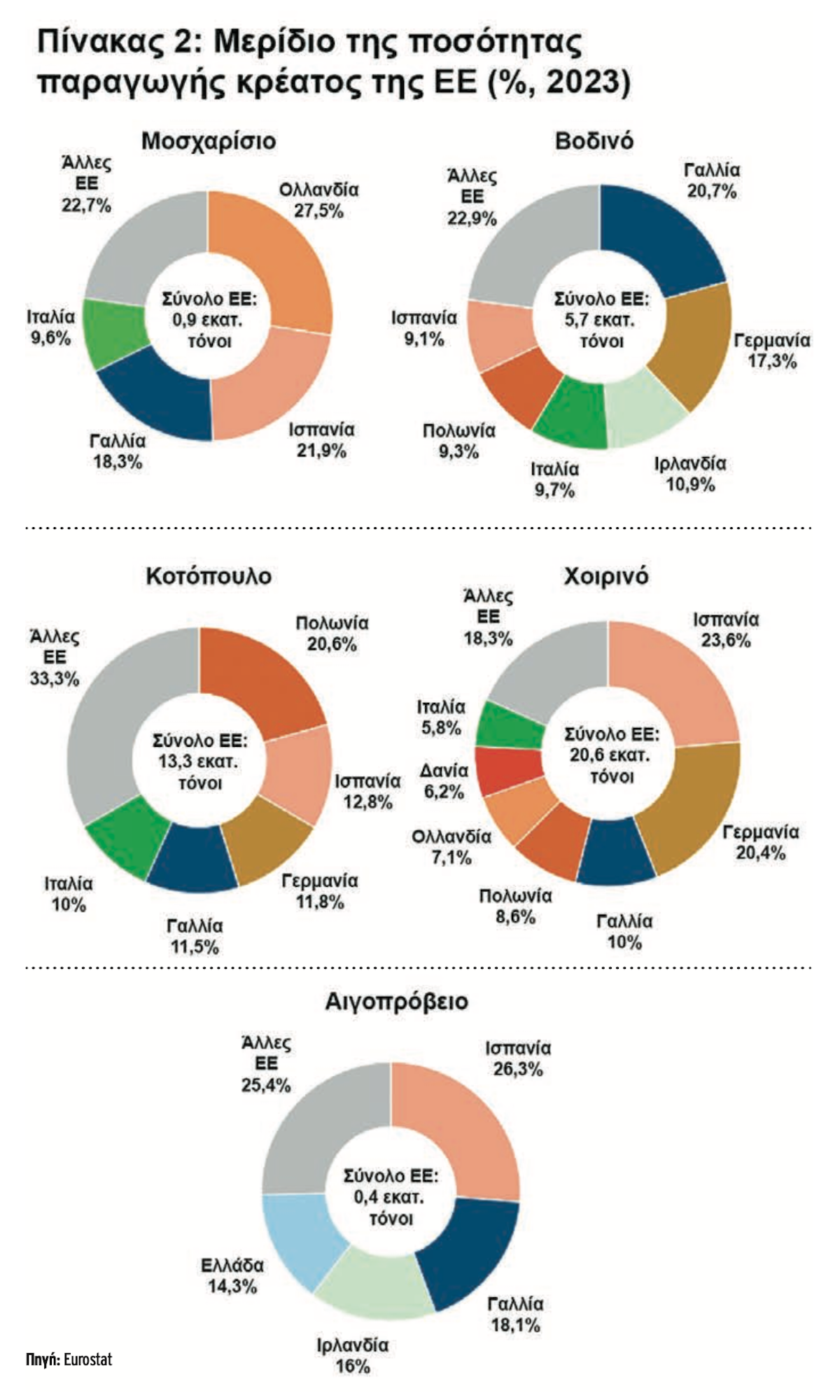 Όσον αφορά την κρεατοπαραγωγή, τα 3/4 του πρόβειου κρέατος της ΕΕ το 2023 παρήχθησαν σε μόλις τέσσερις χώρες: Την Ισπανία (26,5%), τη Γαλλία (18,4%), την Ιρλανδία (17,7%) και την Ελλάδα (11,6%), ενώ αντίστοιχη εικόνα και ακόμα μεγαλύτερο μερίδιο για τη χώρα μας (14,3%) έχουμε αθροιστικά στο αιγοπρόβειο κρέας. Επιπλέον, μεταξύ των χωρών της ΕΕ, οι κύριοι παραγωγοί κατσικίσιου κρέατος είναι η Ελλάδα και η Ισπανία (βλ. πίνακα 2). Όπως είναι εμφανές, υπάρχουν συγκεκριμένες χώρες της ΕΕ, συμπεριλαμβανομένης της Ελλάδας, οι οποίες παρουσιάζουν αυξημένη εξειδίκευση στον κτηνοτροφικό τομέα.