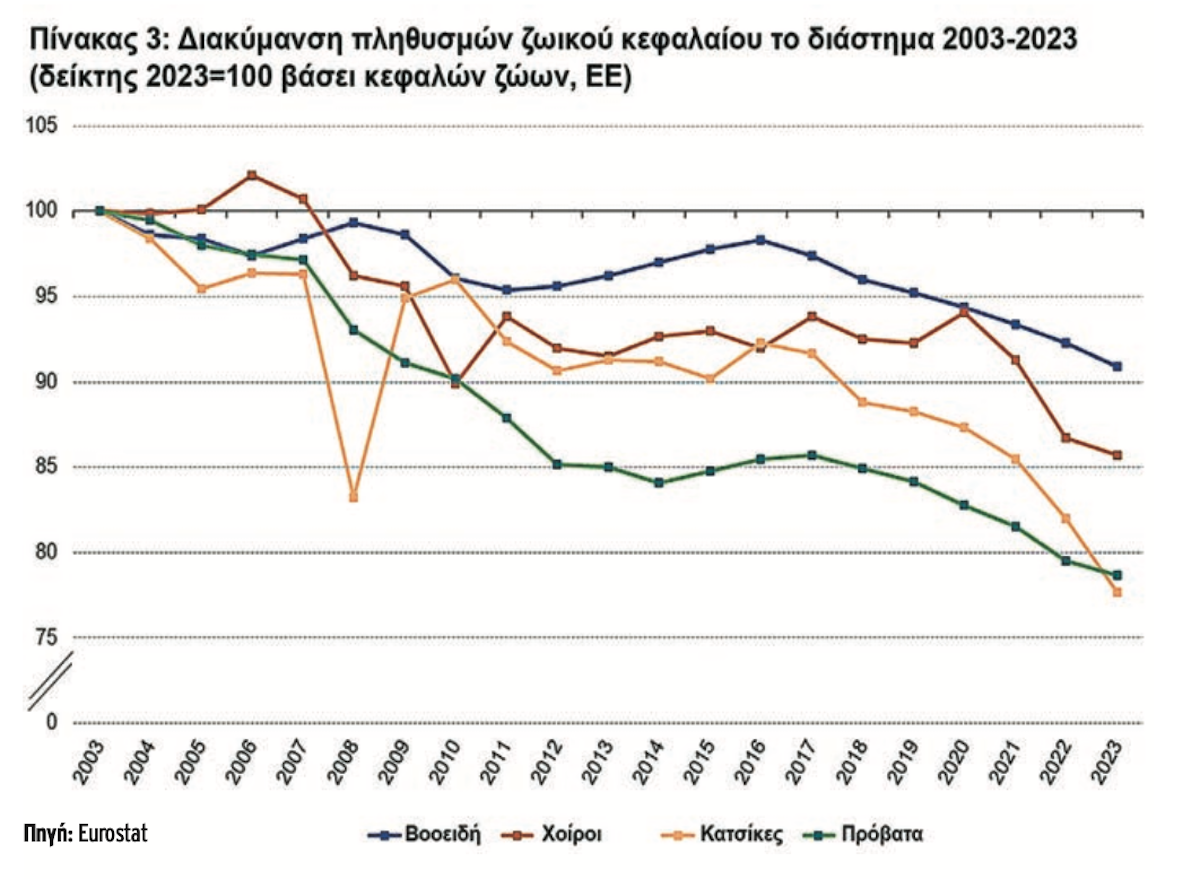 Κατά τη διάρκεια των τελευταίων δύο δεκαετιών σημειώθηκε απότομη μείωση των πληθυσμών των ζώων εκτροφής σε ολόκληρη την ΕΕ (βλ. πίνακα 3). Μεταξύ 2003 και 2023, ο αριθμός των κεφαλών κάθε πληθυσμού ζωικού κεφαλαίου μειώθηκε: Οι πιο απότομες ποσοστιαίες μειώσεις καταγράφηκαν για τον αριθμό των αιγοπροβάτων (περίπου 22%), ενώ η μικρότερη ήταν στον αριθμό των βοοειδών (περίπου 9%).