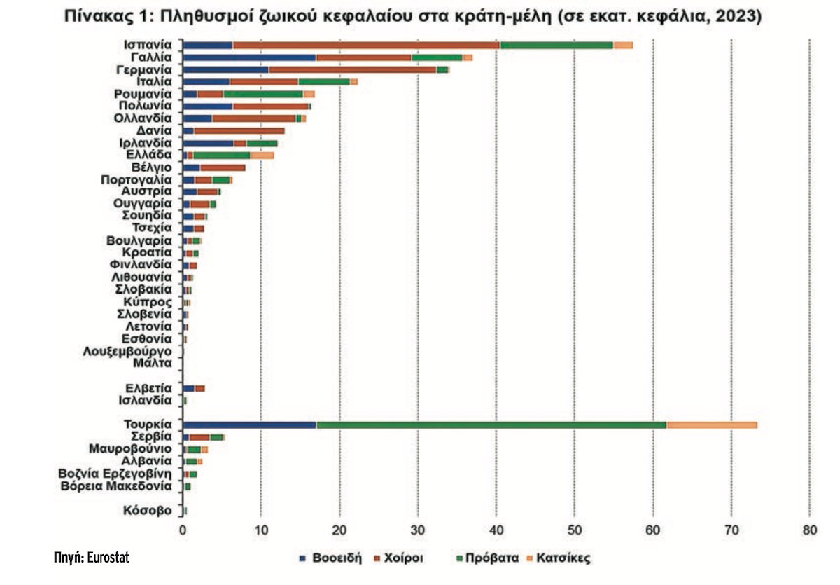 Πιο αναλυτικά, και σύμφωνα πάντα με την τελευταία επικαιροποίηση, η Ισπανία αντιπροσώπευε περίπου το 1/4 των πληθυσμών των χοίρων (25,4%) και των προβάτων (23,6%) της ΕΕ το 2023, ενώ η Ελλάδα είχε παρόμοιο μερίδιο του πληθυσμού των αιγών (25,8%) και η Γαλλία ένα κάπως μικρότερο μερίδιο του πληθυσμού των βοοειδών (22,8%) της Ευρώπης. Μετά την Ισπανία, ο δεύτερος και ο τρίτος μεγαλύτερος πληθυσμός προβάτων στην ΕΕ συναντιόταν στη Ρουμανία (17,9% του συνόλου της ΕΕ) και την Ελλάδα (13,7%). Σε ό,τι αφορά συγκεντρωτικά το ζωικό κεφάλαιο, η Ελλάδα βρισκόταν στη 10η θέση της ΕΕ πέρσι, ξεπερνώντας τα 10 εκατ. κεφάλια, τη στιγμή που η Ισπανία, στην κορυφή της σχετικής λίστας, ξεπερνούσε τα 55 εκατ., ενώ ακολουθούσαν από απόσταση η Γαλλία, η Γερμανία και η Ιταλία (βλ. πίνακα 1).