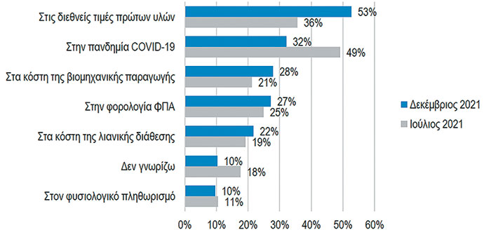 Η πανδημία συνέχιζε, πάντως, να αποτελεί βασική αιτία των αυξήσεων και τον Δεκέμβριο για το 32% των ερωτηθέντων. Αξίζει να σημειωθεί, επίσης, ότι το 27% των συμμετεχόντων αποδίδει τις αυξήσεις στον ΦΠΑ και το 22% στο κόστος της λιανικής διάθεσης. Επίσης, ένα 10% αναφέρει ότι δεν γνωρίζει την αιτία και ανάλογο ποσοστό κάνει λόγο «για φυσιολογικό πληθωρισμό».