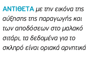 Να σημειώσουμε ότι αντίθετα με την εικόνα της αύξησης της παραγωγής και των αποδόσεων στο μαλακό σιτάρι, τα δεδομένα για το σκληρό σιτάρι είναι οριακά αρνητικά.