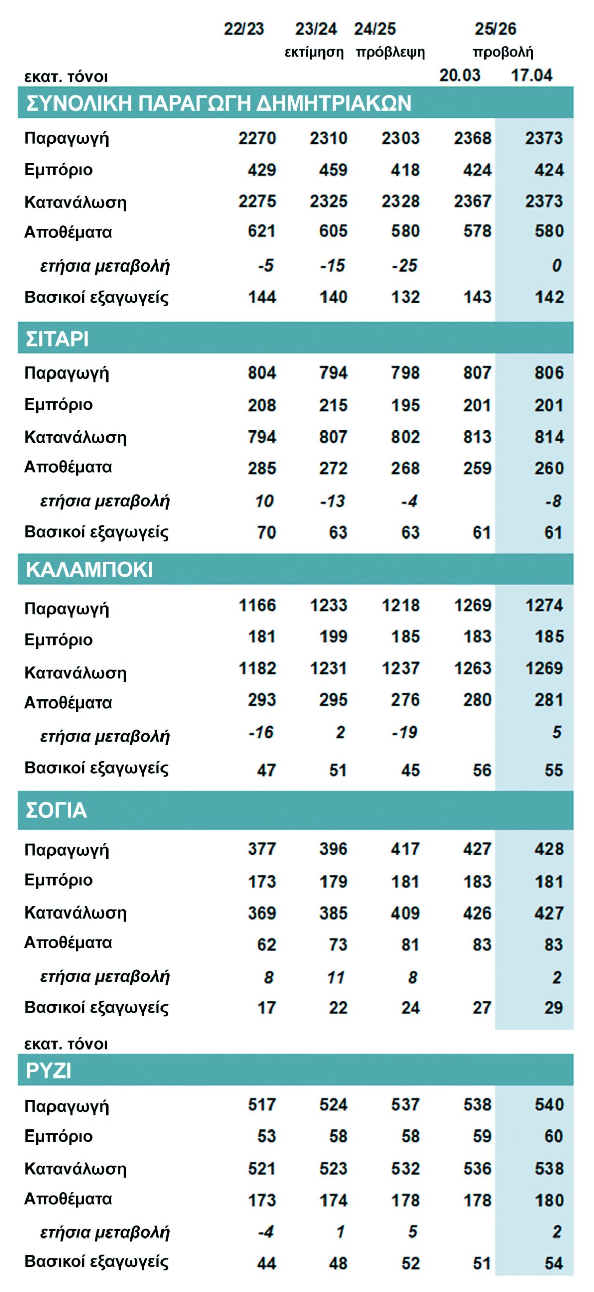 Τα αντίστοιχα μεγέθη παραγωγής για το σιτάρι (μαλακό και σκληρό) είναι 798 εκατ. τόνοι, έναντι 794 το 2023/24 και πρόβλεψη για 806 εκατ. τόνους το 2025/26. Για το δε καλαμπόκι, η παγκόσμια παραγωγή το 2024/25 θα διαμορφωθεί στους 1,218 δισ. τόνους έναντι 1,233 το 2023/24 και 1,274 το 2025/26.