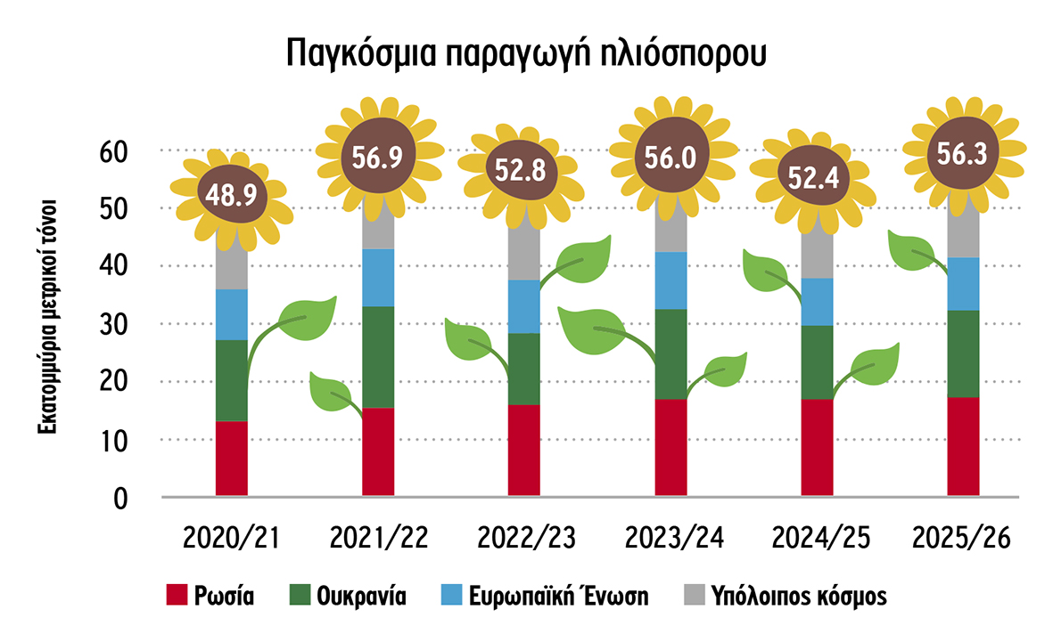 Σύμφωνα με την έκθεση του Ιουλίου 2025 του αμερικανικού υπουργείου Γεωργίας για τους ελαιούχους σπόρους, η παγκόσμια παραγωγή ηλίανθου προβλέπεται να φθάσει τα 56,3 εκατ. τόνους το 2025/26 και θα είναι αυξημένη κατά 3,9 εκατ. τόνους σε σχέση με το 2024/25. Η ανάκαμψη οφείλεται σε μεγάλο βαθμό στις υψηλότερες αποδόσεις, οι οποίες σημείωσαν σημαντική μείωση πέρυσι λόγω των δυσμενών καιρικών συνθηκών στην κύρια περιοχή καλλιέργειας της Μαύρης Θάλασσας. Η συγκομισμένη έκταση προβλέπεται να αυξηθεί ελαφρώς το 2025/26 σε σχέση με πέρυσι.