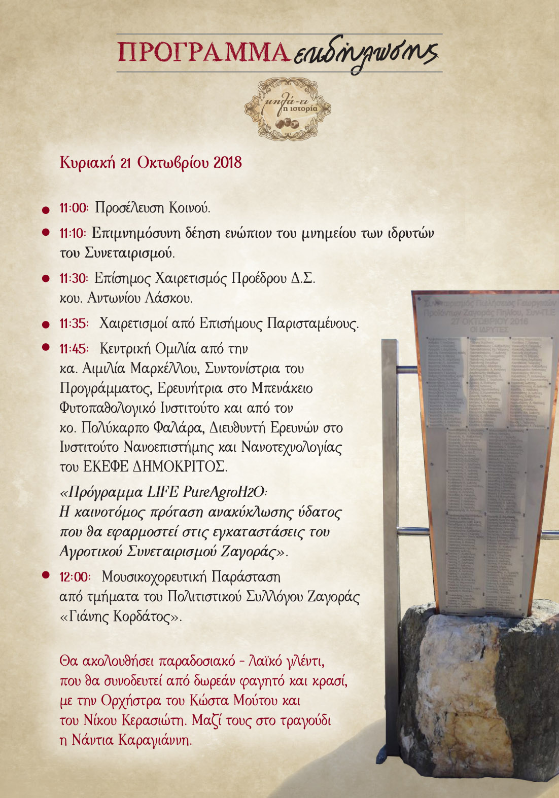 Μια ακόμα χρονιά συμπληρώνεται στις 27 Οκτωβρίου 2018 για τον Αγροτικό Συνεταιρισμό Ζαγοράς Πηλίου, που έχει γίνει πασίγνωστος από το εμπορικό σήμα ΖΑΓΟΡΙΝ. Ο Συνεταιρισμός, αποτελεί την παλαιότερη Οργάνωση στην Ελλάδα με βάση τα έτη διαρκούς λειτουργίας. Πριν δύο χρόνια μάλιστα, καθιερώθηκε να γιορτάζεται η επέτειος ίδρυσης του Συνεταιρισμού με την “Ημέρα Μνήμης και Τιμής στον Συνεταιριστή“, η οποία διοργανώνεται και φέτος για τρίτη συνεχή χρονιά στις 21 Οκτωβρίου 2018.