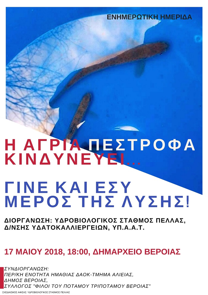 Ο Υδροβιολογικός Σταθμός Πέλλας σε συνεργασία με το Τμήμα Αλιείας ΔΑΟΚ, Περιφερειακή Ενότητα Ημαθίας, το Δήμο Βέροιας και το σύλλογο «Φίλοι του ποταμού Τριπόταμου Βέροιας θα πραγματοποιήσει ημερίδα στις 17/05/2018 στις 18:00 μ.μ., στην αίθουσα συνεδριάσεων του δημοτικού συμβουλίου στο δημαρχείο Βέροιας, με θέμα: «Η άγρια πέστροφα κινδυνεύει…Γίνε και εσύ μέρος της λύσης!»
