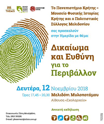 Το Πανεπιστήμιο Κρήτης-Μουσείο Φυσικής Ιστορίας Κρήτης (ΠΚ-ΜΦΙΚ) στο πλαίσιο του έργου LIFE Natura Themis υλοποιεί εκστρατεία ενημέρωσης/ευαισθητοποίησης των φορέων και των πολιτών της Κρήτης με τίτλο «Δικαίωμα και Ευθύνη για το Περιβάλλον», η οποία αφορά στην ανάδειξη των επιπτώσεων της περιβαλλοντικής αυθαιρεσίας και παραβατικότητας στην τοπική ανάπτυξη, την οικονομική πρόοδο και την κοινωνική ευημερία του νησιού.