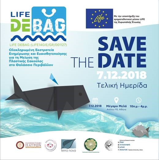 Ημερίδα με θέμα “Ολοκληρωμένη εκστρατεία ενημέρωσης και ευαισθητοπίησης για τη μείωση της πλαστικής σακούλας στο θαλάσσιο περιβάλλον” διοργανώνεται την Παρασκευή 7 Δεκεμβρίου από τις 9:30 π.μ. έως τις 17:30 μ.μ. Μέγαρο Μελά στην Αθήνα, στο πλαίσιο του έργου LIFE DEBAG και με την υποστήριξη του χρηματοδοτικού μέσου LIFE της Ευρωπαϊκής Ένωσης.