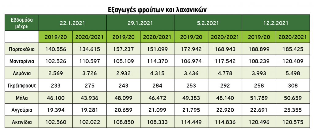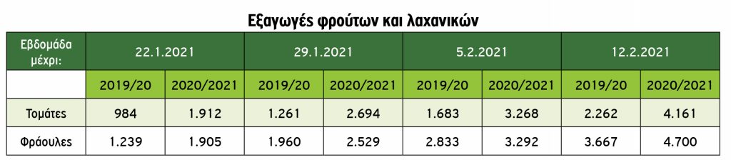 Από την άλλη μεριά, συνεχίζεται με αυξητικούς ρυθμούς η εξαγωγή φράουλας και από 1/1/2021 έως 11/2/2021 ανήλθαν σε 4.700 τόνους έναντι 3.667 τ. αντίστοιχα πέρσι.