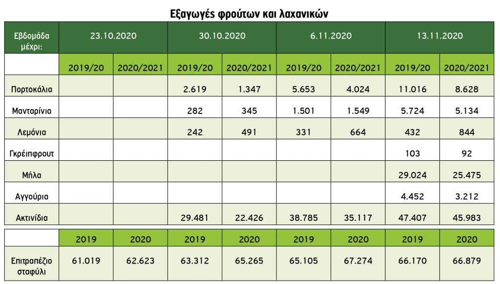 Όσον αφορά τις αποστολές φορτίων οπωροκηπευτικών, η εξαγωγή επιτραπέζιων σταφυλιών ουσιαστικά ολοκληρώθηκε και οι διακινούμενες ακόμη ποσότητες είναι ελάχιστες. Ανακεφαλαιωτικά η εξαγωγή τους παρά την διατήρηση του όγκου στα περσινά επίπεδα, οι τιμές για την φετινή εμπορική περίοδο δεν ήταν σε ικανοποιητικά επίπεδα.