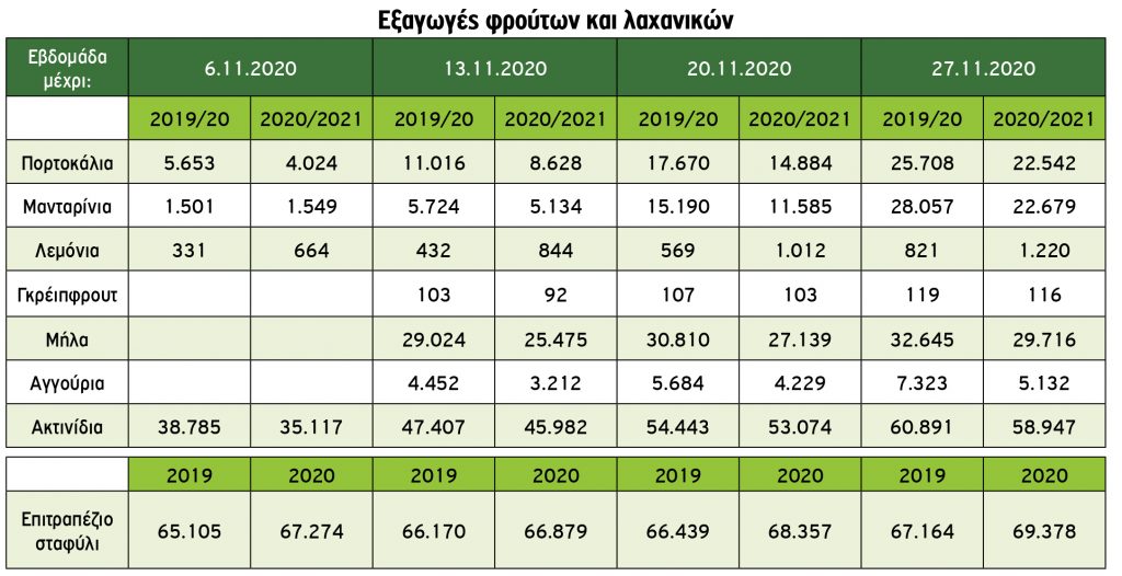 H εξαγωγή επιτραπέζιων σταφυλιών ουσιαστικώς περαιώθηκε και συνεχίζει με ελάχιστες διακινούμενες ποσότητες. Ανακεφαλαιωτικά οι τιμές τους κατά την φετινή εμπορική περίοδο δεν ήταν σε ικανοποιητικά επίπεδα.