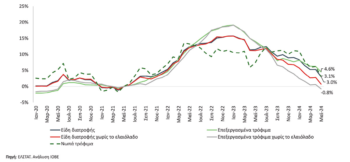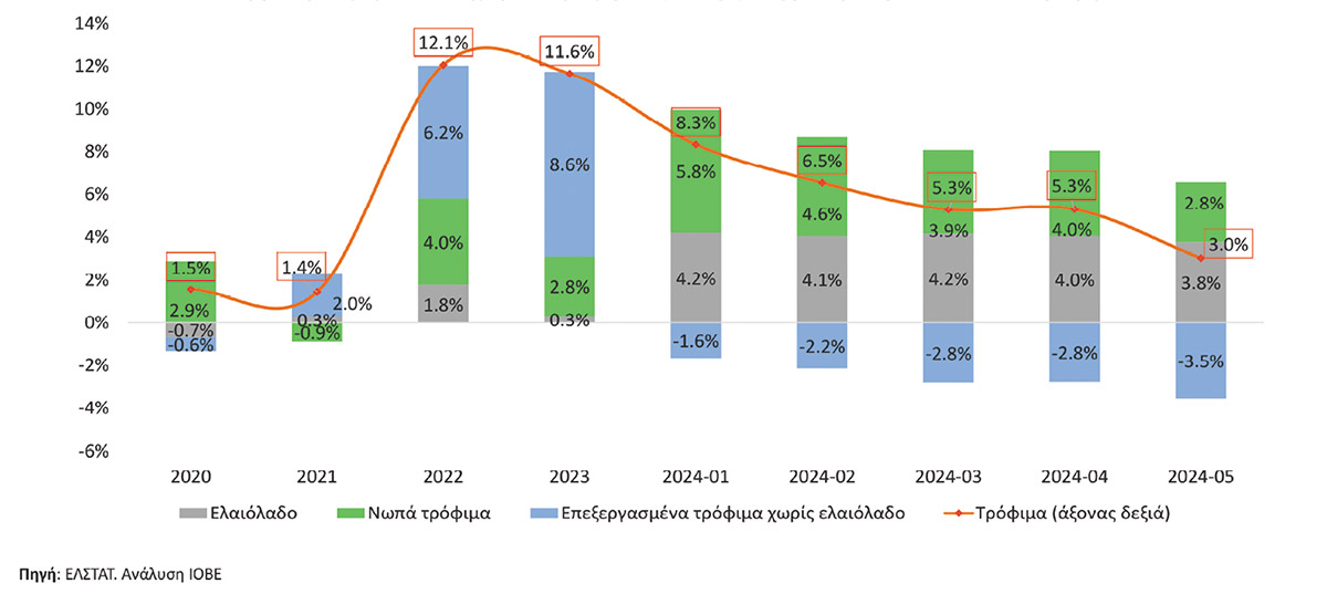 Σύμφωνα με μελέτη του ΙΟΒΕ, που πραγματοποιήθηκε για λογαριασμό του Συνδέσμου Βιομηχανίας Τροφίμων και Ποτών και δημοσιεύτηκε τις προηγούμενες μέρες (Ιούλιος 2024), τον Μάιο του 2024 ο πληθωρισμός στα είδη διατροφής ήταν ηπιότερος χωρίς το ελαιόλαδο (0,7%) έναντι πληθωρισμού 3,0% στην κατηγορία συμπεριλαμβανομένου του προϊόντος. Αξιοσημείωτο είναι ότι ευρύτερα στην περίπτωση των επεξεργασμένων τροφίμων, χωρίς να περιλαμβάνεται σε αυτά το ελαιόλαδο, ο Γενικός Δείκτης Τιμών Καταναλωτή (ΓΔΤΚ) κατέγραψε –έστω και μικρή– υποχώρηση, κατά -0,8%. Ωστόσο, η αύξηση για τα είδη διατροφής στην Ελλάδα παραμένει σημαντικά υψηλότερη από το γενικό επίπεδο τιμών καταναλωτή, όπως σημειώνεται, συνθήκη που καταγράφεται από τα μέσα του 2022.