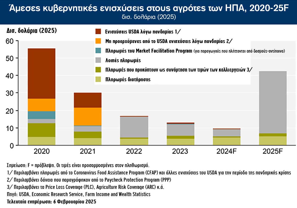 Το USDA προβλέπει ότι οι κρατικές πληρωμές προς τους αγρότες θα αυξηθούν κατά περισσότερα από 33 δισεκατομμύρια δολάρια το 2025.