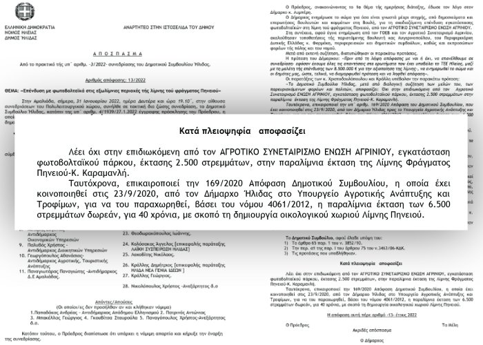 Ηχηρό «όχι» στην επιδιωκόμενη από τον «Αγροτικό Συνεταιρισμό Ένωση Αγρινίου» εγκατάσταση φωτοβολταϊκού πάρκου, έκτασης 2.500 στρεμμάτων, στην παραλίμνια έκταση της λίμνης φράγματος Πηνειού – Κ. Καραμανλή, είπε κατά πλειοψηφία στην τελευταία συνεδρίασή του το δημοτικό συμβούλιο του Δήμου Ήλιδας.