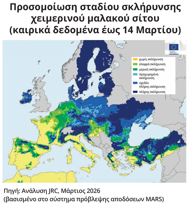 Με θετικούς οιωνούς, εισέρχονται στην άνοιξη οι χειμερινές καλλιέργειες στην Ευρώπη, καθώς η έξοδος από τη χειμερινή νάρκη πραγματοποιείται υπό γενικά καλές αγρομετεωρολογικές συνθήκες. Σύμφωνα με το τελευταίο δελτίο του Κοινού Κέντρου Ερευνών της ΕΕ (JRC), στις 23 Μαρτίου, η επαρκής εδαφική υγρασία και οι ήπιες θερμοκρασίες στα τέλη του χειμώνα έχουν ήδη ενεργοποιήσει τη βλαστική ανάπτυξη σε μεγάλο μέρος της ηπείρου, δημιουργώντας μια ισχυρή βάση για την εξέλιξη της φετινής παραγωγής, επιτρέποντας την προσδοκία για ικανοποιητικές αποδόσεις.
