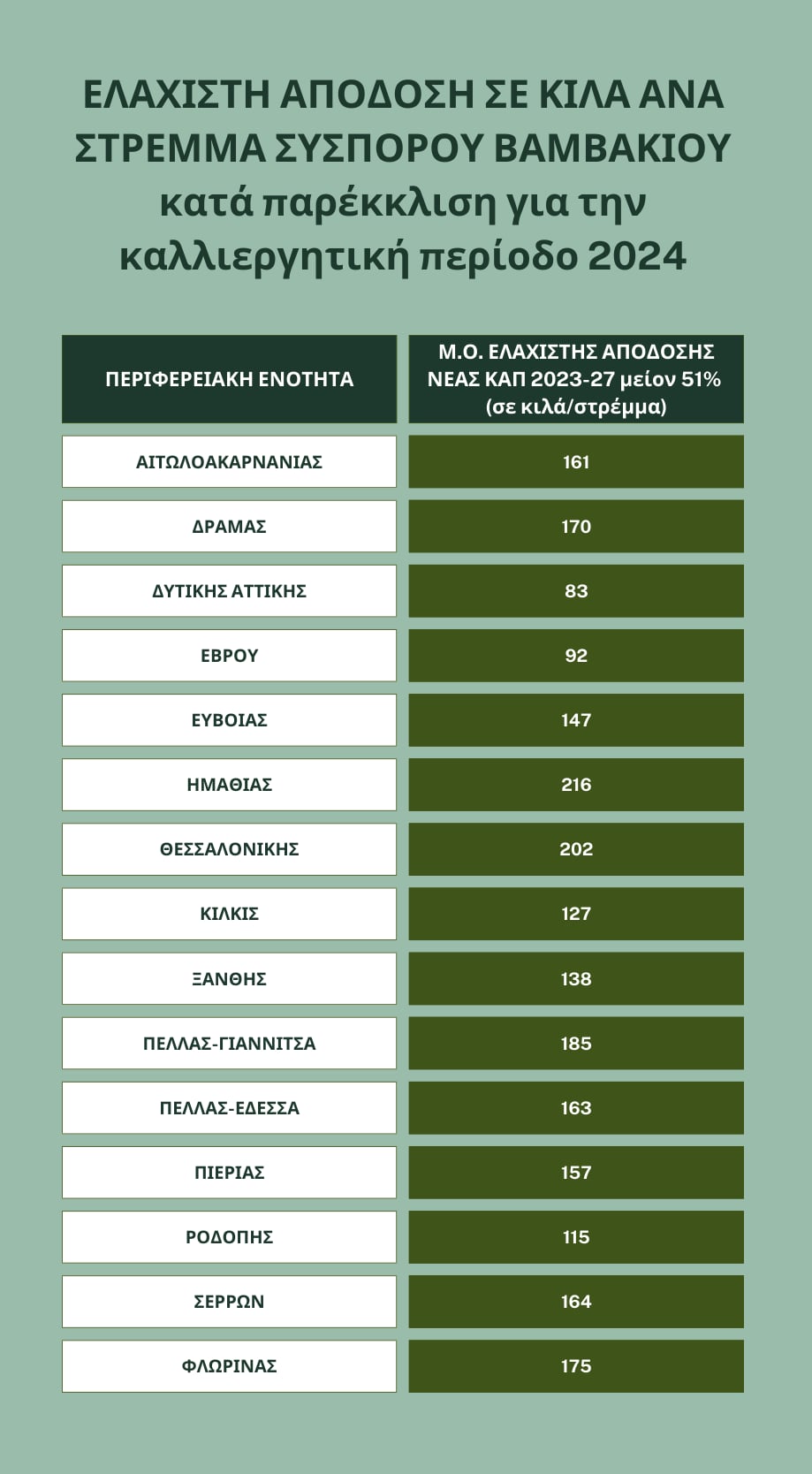Στις Περιφερειακές Ενότητες Αιτωλοακαρνανίας, Δράμας, Δυτικής Αττικής, Έβρου, Εύβοιας, Ημαθίας, Θεσσαλονίκης, Κιλκίς, Ξάνθης, Πέλλης, Πιερίας, Ροδόπης, Σερρών, και Φλωρίνης, μειώνεται η ελάχιστη στρεμματική απόδοση, επιπλέον 30% και ως εκ τούτου ορίζεται με βάση το μέσο όρο της πραγματικής στρεμματικής απόδοσης της πενταετίας 2016-2020 κάθε Περιφερειακής Ενότητας μειωμένο κατά 51% σύμφωνα με τον ακόλουθο πίνακα ελάχιστης απόδοσης κιλών σύσπορου βαμβακιού ανά στρέμμα:
