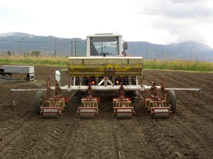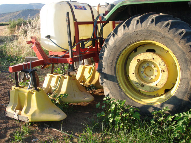 - Εφαρμογή ολοκληρωμένων συστημάτων φυτοπροστασίας βαμβακιού ντομάτας και καλαμποκιού χαμηλών εισροών γ.φ. (τα ονομαζόμενα LCM), που διαμορφώθηκαν με βάση τα χαρακτηριστικά της περιοχής και τα οποία προχώρησαν πέραν των εθνικών απαιτήσεων για την Ολοκληρωμένη Φυτοπροστασία (AGRO 1 και 2.2). Ως παραδείγματα δράσεων θα μπορούσαν να αναφερθούν η εγκατάσταση και λειτουργία συστήματος παρακολούθησης εντομολογικών εχθρών, με στόχο η πληροφορία εμφάνισης των εχθρών σε υπο-περιοχές, να είναι άμεση, μεταξύ γεωπόνων, παραγωγών και υπηρεσιών της περιφέρειας και αποτελεσματική ως προς το στάδιο, το σκεύασμα και τον χρόνο εφαρμογής. Τεχνικές, όπως η εφαρμογή προφυτρωτικών ζιζανιοκτόνων μόνο επί των γραμμών φύτευσης (φωτό 1) και όχι καθολικά και μεταγενέστερα η εφαρμογή μεταφυτρωτικών ζιζανιοκτόνων μεταξύ των γραμμών (φωτό 2), με τη χρήση αισθητήρων ανίχνευσης χλωροφύλλης, είχαν ως αποτέλεσμα τη δραστική μείωση χρήσης ζιζανιοκτόνων κατά 15%-90%, ανάλογα με τη περίπτωση.