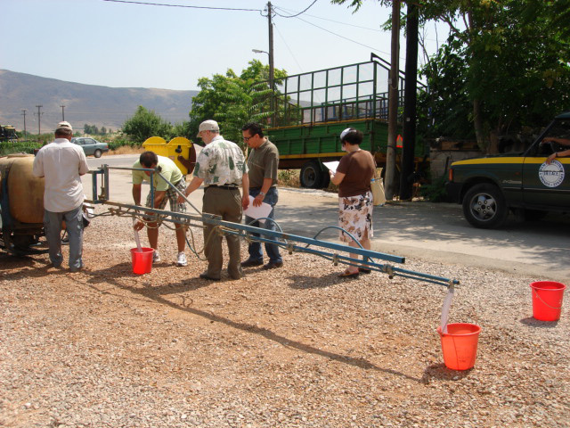 - Ανάπτυξη στρατηγικής ελέγχου διασποράς του ψεκαστικού νέφους (ψ.ν.) και μέτρησή του στον αγρό, πριν και μετά τις επισκευές των ψεκαστικών μηχανημάτων της περιοχής, η οποία πραγματοποιήθηκε στη διάρκεια του προγράμματος. Επετεύχθη σημαντική μείωση της διασποράς του ψ.ν. λόγω επισκευασμένων ψεκαστικών και χρήσης ακροφυσίων χαμηλής διασποράς (φωτό 3).