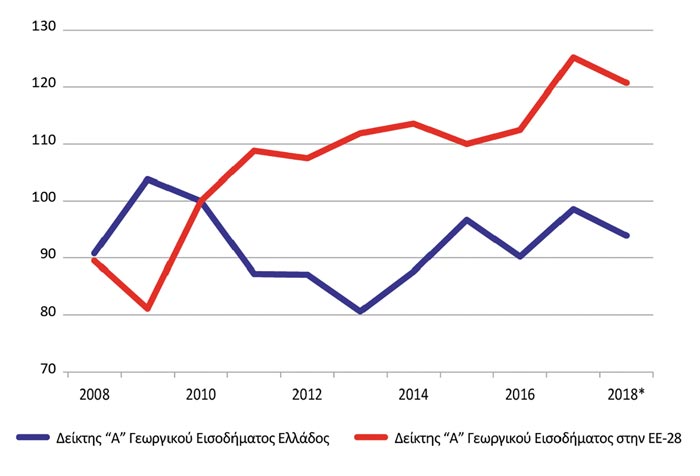 Όπως φαίνεται και στο Γράφημα 1, με βάση την εκτίμηση του γεωργικού εισοδήματος σε πραγματικές τιμές και όρους πλήρους απασχόλησης, που εκφράζεται από τον «Δείκτη Α» της Eurostat, το γεωργικό εισόδημα στην Ελλάδα υπολείπεται σημαντικά του μέσου όρου στην ΕΕ-28. Από τα οριστικά στοιχεία του 2017, προκύπτει ότι ο Δείκτης «A» του γεωργικού εισοδήματος στην Ελλάδα (98,6) υπολείπεται του αντίστοιχου της ΕΕ-28 (125,2) κατά 27 ποσοστιαίες μονάδες και η απόκλιση, σύμφωνα με τις εκτιμήσεις της Eurostat, φαίνεται να μεγεθύνεται το 2018 (28,5%).