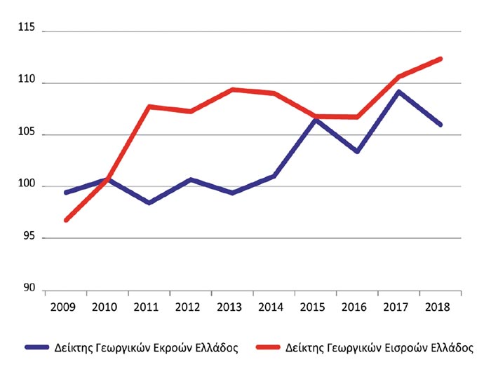 Μεγαλύτερο εξάλλου παραμένει το εύρος της απόκλισης αυτής από χώρες με ανταγωνιστικά προϊόντα, όπως η Ισπανία (39,6%) και η Ιταλία (38,%). Η αρνητική αυτή εξέλιξη και γενικότερα η ταχύτερη άνοδος της αξίας των γεωργικών εισροών με πολλαπλάσιο μέσο ετήσιο ρυθμό ανόδου στη δεκαετία 2009-2018 (+1,7%) από εκείνο της αξίας της γεωργικής παραγωγής (+0,7%) αποτελεί μια από τις σημαντικότερες προκλήσεις που αντιμετωπίζει η ελληνική γεωργία, γιατί περιορίζει την προστιθέμενη αξία και μειώνει το γεωργικό εισόδημα.