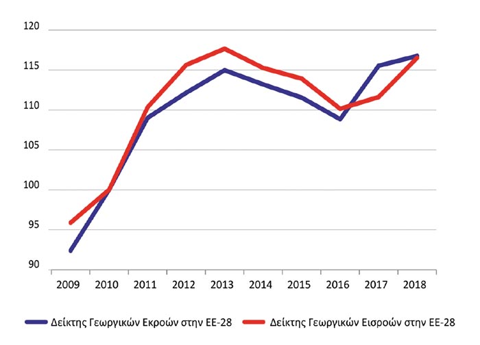 Η σύγκριση εξάλλου του ρυθμού ανόδου της αξίας των εισροών σε σχέση με την αξία της γεωργικής παραγωγής (εκροές) παραμένει σαφώς δυσμενέστερη στην περίπτωση της Ελλάδος ως προς την αντίστοιχη εξέλιξη στην ΕΕ-28 και αναδεικνύει τη σημαντική προσπάθεια που πρέπει να καταβληθεί για την ταχύτερη άνοδο της αξίας της εγχώριας γεωργικής παραγωγής (Γράφημα 2).