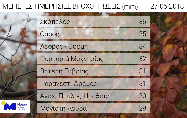 Κατά τις πρώτες ώρες της Τετάρτης 27/06 η “Νεφέλη” έπληξε με βροχές και καταιγίδες τόσο ηπειρωτικές, όσο και νησιωτικές περιοχές της χώρας. Όπως φαίνεται από τον πίνακα όπου παρουσιάζονται τα μεγαλύτερα ύψη ολικού υετούς έως τις 09:00 τοπική ώρα, τα ισχυρότερα φαινόμενα σημειώθηκαν στο Βόρειο Αιγαίο, την Εύβοια, και τα βόρεια ηπειρωτικά.