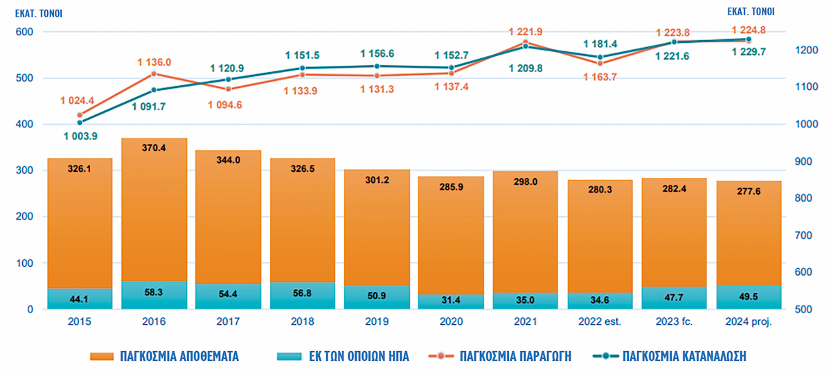 Και προσθέτει: «Αν και η χρήση αραβοσίτου (135,8 εκατ. τόνους, -2,3% ετησίως) προβλέπεται να μειωθεί λόγω της κακής συγκομιδής στις βασικές καταναλωτικές περιοχές της Νότιας Αφρικής, η συνολική κατανάλωση προβλέπεται να ανέλθει σε επίπεδα ρεκόρ, 1.229,7 εκατ. τόνους (+1,6 εκατ. τόνους). Ειδικότερα, η χρήση για ζωοτροφές αναμένεται αυξημένη κατά 1,3% και για βιομηχανική χρήση κατά 0,6%».