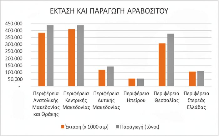 Έκταση και παραγωγή καλαμποκιού στις διάφορες περιοχές της Ελλάδας.