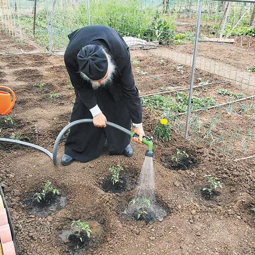 Ο ίδιος, άριστος γνώστης της γης, καθότι συντηρούσε και καλλιεργούσε επί 22 ολόκληρα χρόνια έναν μεγάλο λαχανόκηπο στο μοναστήρι του Αγίου Δημητρίου στα Τέμπη, δείχνει τον δρόμο στους νέους για το πώς θα καλλιεργούν τα προϊόντα.