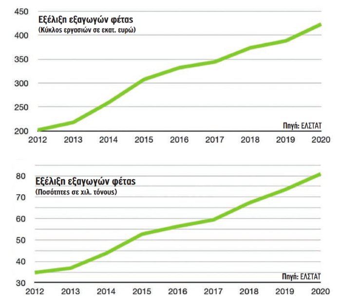 Ισχυρή αύξηση πωλήσεων (+25%) κατέγραψε η εταιρεία «Ελληνικά Γαλακτοκομεία ΑΕ» στις αγορές του εξωτερικού σε ό,τι αφορά τη «Φέτα ΠΟΠ» για το 2020. Αξίζει να σημειωθεί ότι τα αποτελέσματα του 2020 έρχονται μετά τις πολύ θετικές επιδόσεις των προηγούμενων ετών (2018, 2019), κάτι που καταδεικνύει ότι η φέτα στις διεθνείς αγορές βρίσκεται σε τροχιά δυναμικής ανάπτυξης, καθώς όλο και περισσότεροι καταναλωτές αναγνωρίζουν την υψηλή διατροφική αξία και τα ιδιαίτερα γευστικά χαρακτηριστικά της.