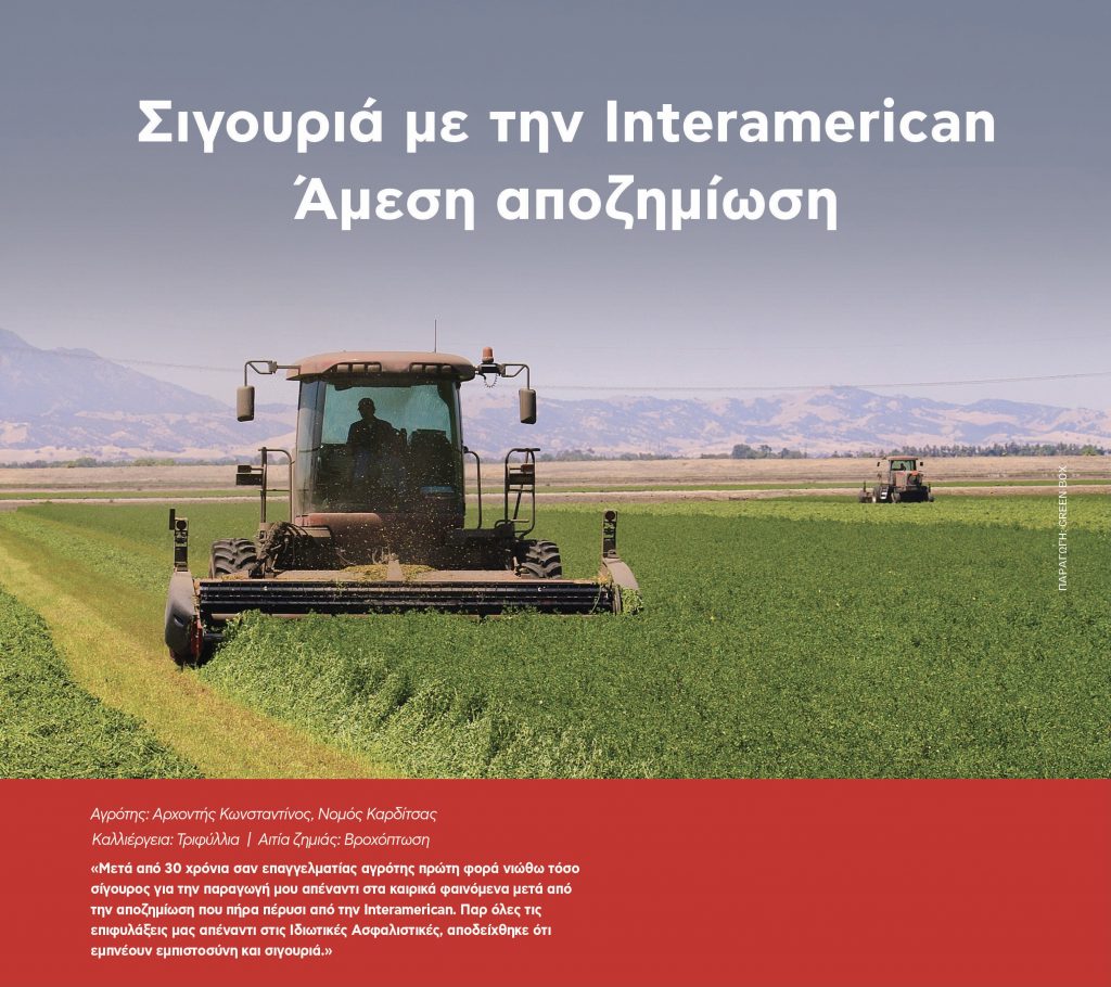 Η έμφαση στην ανάπτυξη του πρωτογενούς τομέα (γεωργία, κτηνοτροφία) σε συνδυασμό με τους κλιμακούμενους κινδύνους που επιφυλάσσουν τα ακραία φυσικά φαινόμενα για τις σχετικές δραστηριότητες, λόγω της κλιματικής αλλαγής, ενισχύουν την ανάγκη μιας ολιστικής ασφαλιστικής προσέγγισης. Η INTERAMERICAN, διαβλέποντας αυτές τις εξελίξεις, από το 2016 έχει εισέλθει στο πεδίο ασφάλισης του αγροτικού τομέα. Ήδη, έως και το 2020, πολλές επιχειρήσεις και καλλιεργητές που επλήγησαν αυτά τα τελευταία χρόνια από τις καταστροφικές συνέπειες θεομηνιών, κατάφεραν να διατηρήσουν τη συνέχεια των δραστηριοτήτων τους και να αντιμετωπίσουν ζημιές που προκλήθηκαν χάρη στις αποζημιώσεις που κατέβαλε σε αυτούς η εταιρεία.
