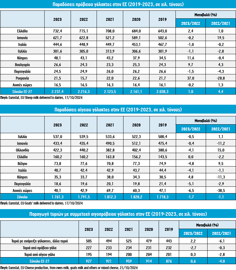 Η εξέλιξη αυτή προήλθε κυρίως από την άνοδο της παραγωγής σε τυριά με ανάμειξη γάλακτος, στα οποία κυριαρχεί η Ελλάδα (220 χιλ. τόνοι), χάρη στη συμμετοχή του αιγοπρόβειου γάλακτος στην παρασκευή φέτας, ο όγκος της οποίας ανήλθε το 2023 σε 148 χιλ. τόνους (+2,7%). Αντίθετα, πτώση σημειώθηκε στα τυριά από πρόβειο γάλα, προερχόμενα κυρίως από την Ισπανία και την Ιταλία, ενώ σταθερότητα παρουσίασαν τα τυριά από αίγειο γάλα, με κυριότερη παραγωγό χώρα τη Γαλλία.