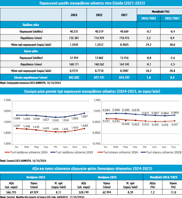Η πτωτική αυτή τάση αναμένεται να ενταθεί στη συνέχεια, συνδεόμενη με τα συσσωρευμένα προβλήματα που αντιμετωπίζει η γαλακτοπαραγωγός αιγοπροβατοτροφία της χώρας. Μετά τις εξαιρετικά δυσμενείς επιπτώσεις από τις πλημμύρες που ενέσκηψαν στη Θεσσαλία τον Σεπτέμβριο του 2023, που κατέστρεψαν 2.000 κτηνοτροφικές εκμεταλλεύσεις, ακολούθησε η ταχεία εξάπλωση της πανώλης των αιγοπροβάτων, που εκδηλώθηκε τον Ιούλιο του τρέχοντος έτους στη Θεσσαλία, ενώ λίγο αργότερα, τον Αύγουστο του 2024, εντοπίστηκαν στον Έβρο κρούσματα ευλογιάς σε αιγοπρόβατα, με ταχεία επέκτασή της στη συνέχεια σε πέντε τουλάχιστον περιφέρειες της χώρας.