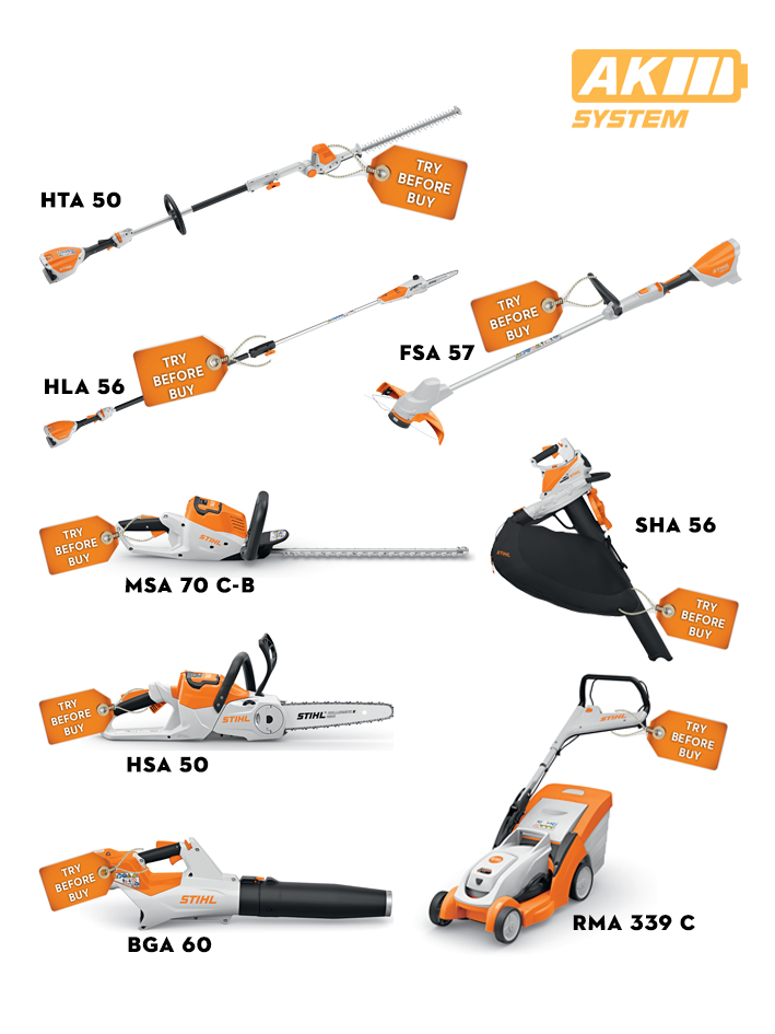 Το πρόγραμμα δωρεάν δοκιμής περιλαμβάνει μια εκτεταμένη γκάμα προϊόντων, από αλυσοπρίονα, χορτοκοπτικά, φυσητήρες, μηχανές γκαζόν κ.λπ..
