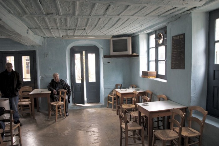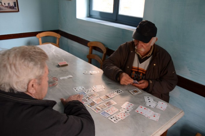Ο πληθυσμός του καφενείου λιγοστός, μέσος όρος ηλικίας πάνω από τα 80 χρόνια, αλλά οι θαμώνες ένας κι ένας, μερακλήδες και εκλεκτοί. Σήμερα Κυριακή πρωί, το μαγαζί είχε ακόμα λιγότερο κόσμο. Δυό κηδείες γερόντων είχαν μαζέψει τον κόσμο στο κεντρικό καφενείο, αυτό απέναντι από την εκκλησία, για τον καφέ της παρηγοριάς. Κι ήταν και πελάτες του!
