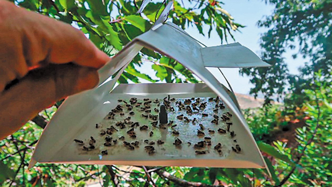 Για την παρακολούθηση της εποχιακής δραστηριότητας των κυριοτέρων εντόμων-εχθρών της καστανιάς, Laspeyresia splendana, Laspeyresia fagiglandana και Pammene fasciana, τοποθετήθηκε από μία φερομονική παγίδα (Εικόνα 1) για το κάθε είδος καρπόκαψας σε κάθε περιοχή, από τον Ιούλιο έως και τον Οκτώβριο του 2023. Για την εκτίμηση της προσβολής ελέγχονταν 60 αχαίνια ανά καλλιέργεια ανά εβδομάδα. Για την παρακολούθηση του πληθυσμού του βαλάνινου (Curculio elephas) εφαρμόζονταν τινάγματα κλάδων και έλεγχος αχαινίων σε 15 δένδρα καστανιάς στον κάθε καστανεώνα και 15 τινάγματα στα πλησιέστερα δένδρα βελανιδιάς.