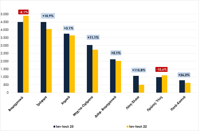 Γράφημα 1. Μεταβολή κυριότερων κλάδων, χωρίς πετρελαιοειδή, Ιανουάριος-Ιούλιος 2022/2023