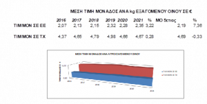 Τέλος ελαφρώς αυξητική καταγράφεται η εξέλιξη της μέσης τιμής μονάδος, ανά εξαγόμενο κιλό οίνου. Το 2021 παρουσιάζει αύξηση κατά 0,28% (4,67 €/kg/2021 – 4,66 €/kg/2020), ενώ ελαφρά μείωση της μέσης τιμής μονάδος καταγράφεται σε σχέση με την προηγούμενη 5ετία που ανέρχεται σε 0,33% (Μέσος Όρος τιμής 5ετίας 4,69 €/kg).