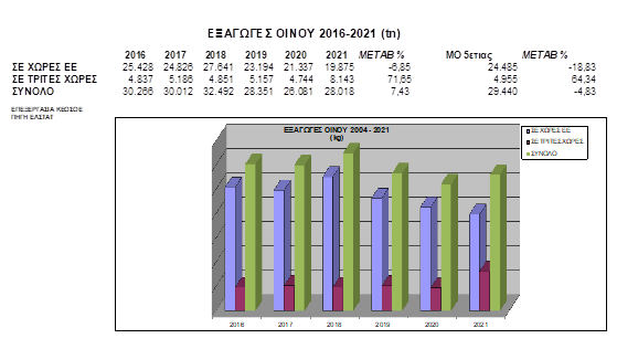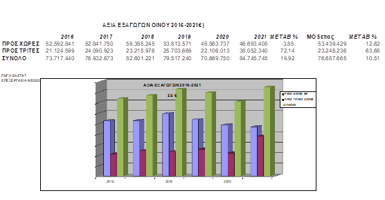 Σε αξία οι ελληνικές εξαγωγές οίνων προς χώρες της Ε.Ε. το 2021 παρουσιάζουν υποχώρηση της τάξης του 3,85% (46.893.405 € /2021 – 48.563.737 €/2020), όπως επίσης παρουσιάζουν μείωση της τάξης του 12,62% σε σχέση με το μέσο όρο της προηγούμενης 5ετίας.