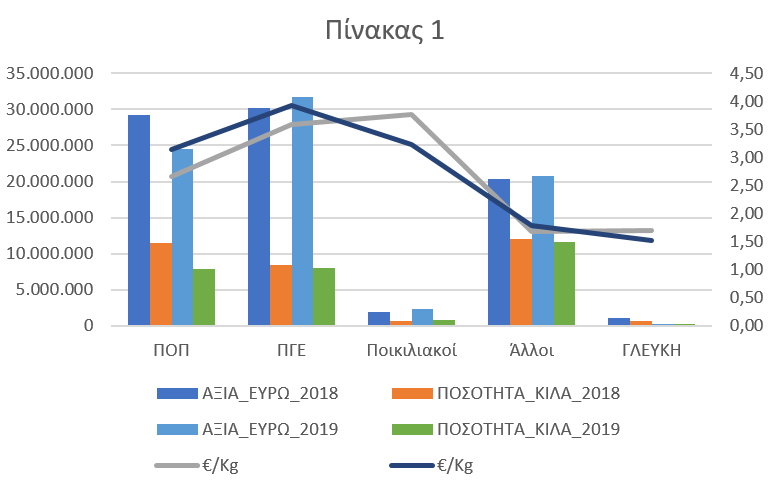 Να σημειωθεί ότι και το 2019 οι ΠΓΕ εξακολουθούν να εξάγονται με την υψηλότερη μέση τιμή, σε σχέση με τις υπόλοιπες κατηγορίες οίνων. Το 2018 με υψηλότερη μέση τιμή, εξάγονταν οι Ποικιλιακοί Οίνοι (3,76 €/kg)
