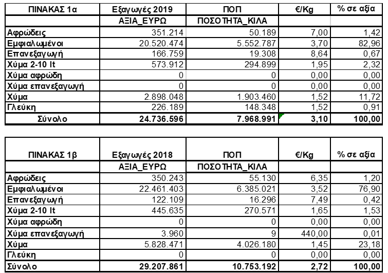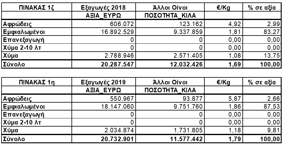Άνευ σημασίας είναι και οι εξαγωγές οίνων με ΠΓΕ σε χύμα μορφή (2019: 1,43% – 2018: 1,71%).