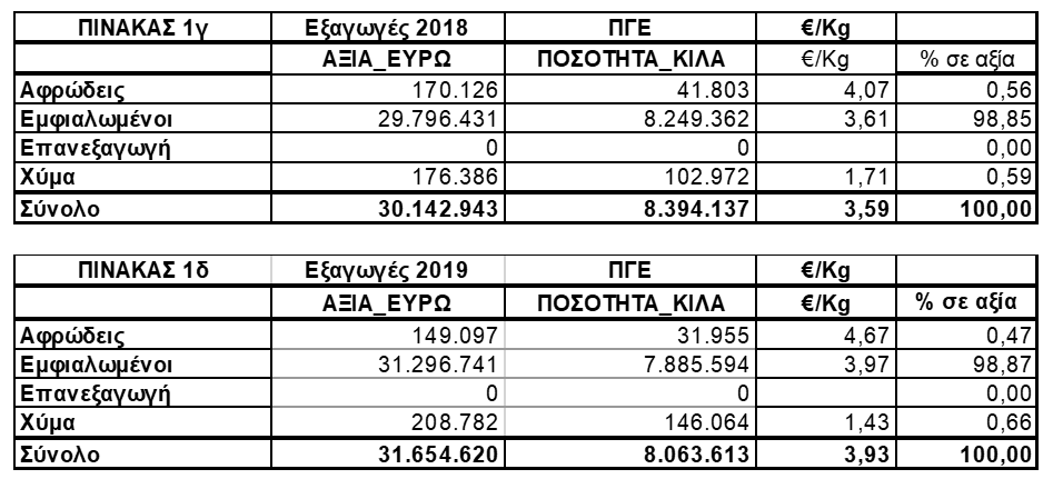 Οι εξαγωγές γλευκών αντιπροσωπεύουν μικρές αξίες και μικρές μέσες τιμές ανά kg (2018: 1,69 € / kg και 2019: 1,52 € / kg).