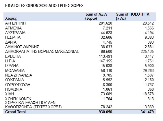 Μείωση επίσης κατά 74,74% παρουσιάζουν οι ποσότητες εισαγωγής οίνων από Τρίτες Χώρες (341 tn/2020 – 1350 tn/2019).