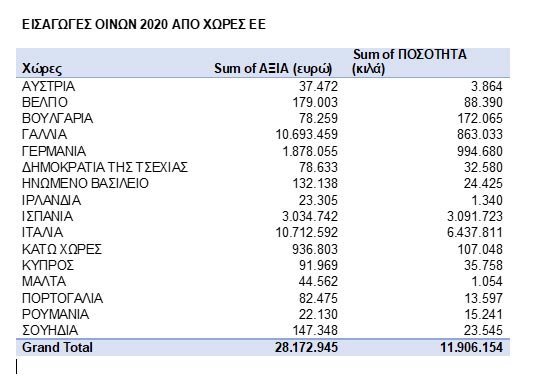 Οι εισαγωγές οίνου αφορούν κυρίως ενδοκοινοτικές αποκτήσεις, δηλαδή από χώρες της Ε.Ε. από την οποία οι αποστολές μειώθηκαν κατά 40% σε αξία (28.172.945 €/2020 – 46.952.550 €/2019), ενώ μείωση κατά 23,91% παρουσιάζει και η σύγκριση των μεγεθών σε αξία του 2020, με το μέσο όρο της προηγούμενης 5ετίας 2015 – 2019, εξαιτίας της σημαντικής μείωσης του 2020.