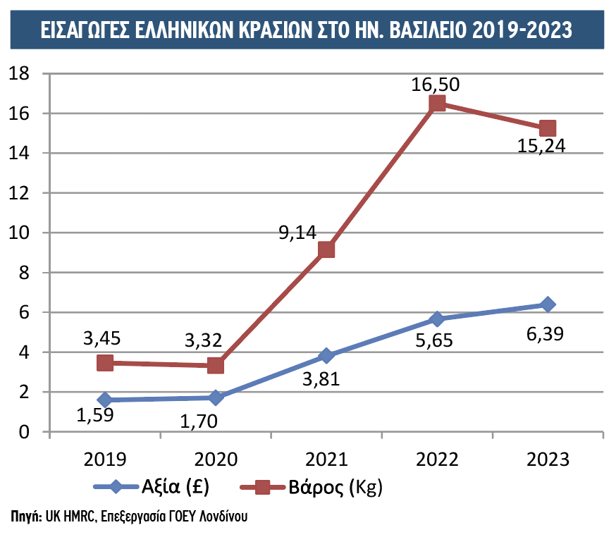 Το 2023, οι ελληνικές εξαγωγές οίνου στο Ην. Βασίλειο ανήλθαν σε 6,387 εκατ. λίρες και 1,524 τόνους, με την αξία τους να εμφανίζεται αυξημένη 13% από το προηγούμενο έτος και τετραπλάσια σε σχέση με τον μέσο όρο της πενταετίας, παρά το γεγονός ότι οι ποσότητες ήταν μειωμένες κατά 7%. Παράλληλα, μικρή, αλλά κατακόρυφα αυξημένη ήταν η ποσότητα ελληνικού αφρώδους οίνου, ενώ και οι εισαγωγές σε συσκευασίες μεγαλύτερες των 2 λίτρων ήταν ανεβασμένες, έστω κι αν παρέμειναν σχετικά περιορισμένες.