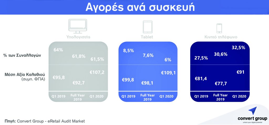 Από την ανάλυση της Convert Group, προκύπτει ότι ολοένα και περισσότεροι καταναλωτές προτιμούν να κάνουν τα ηλεκτρονικά τους ψώνια μέσω κινητού τηλεφώνου. Είναι χαρακτηριστικό ότι οι online αγορές μέσω κινητού αντιπροσώπευαν το 32,5% του συνόλου στο πρώτο τρίμηνο του 2020, όταν έναν χρόνο πριν το αντίστοιχο ποσοστό ήταν στο 27,5% και για το σύνολο του 2019 στο 30,6%.