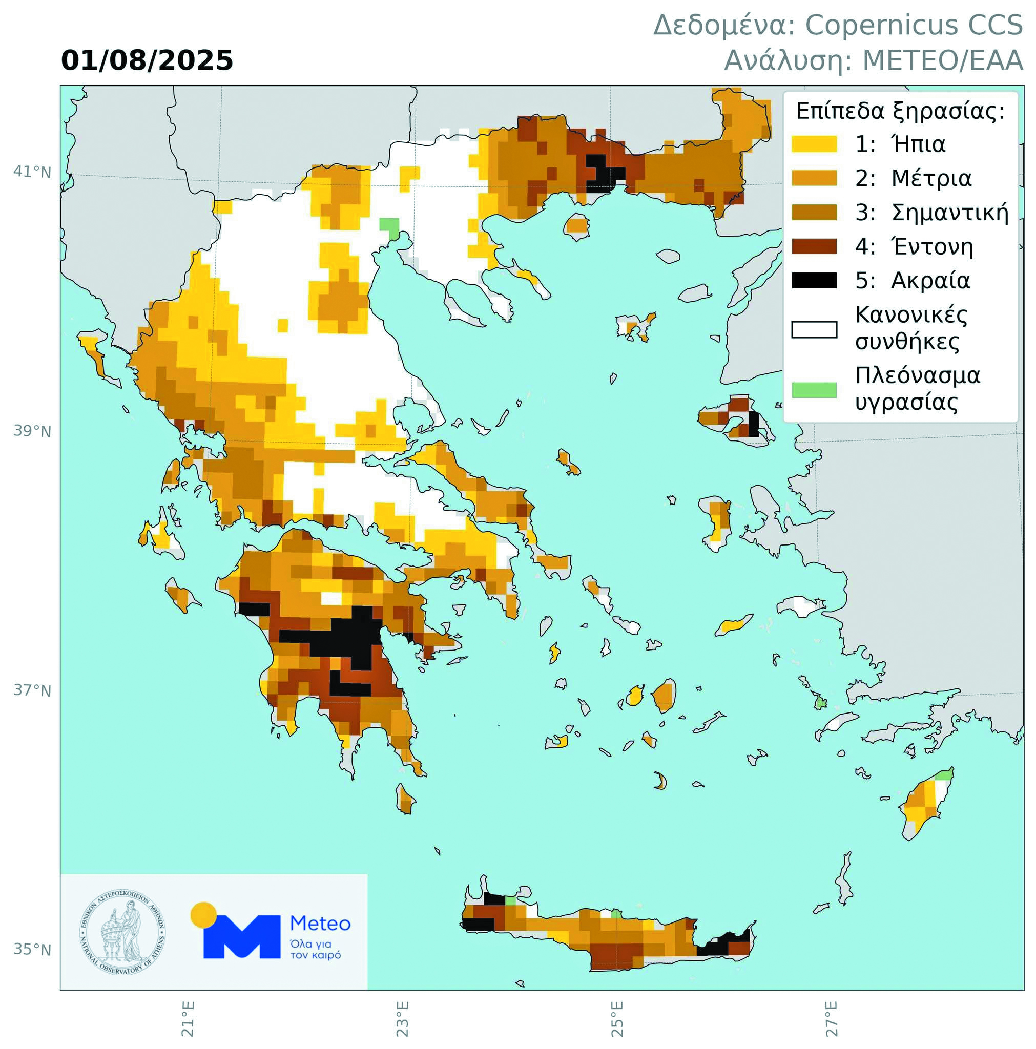Παραθέτοντας χάρτη που απεικονίζει τον δείκτη ξηρασίας στην Ελλάδα την 1η Αυγούστου 2025, σύμφωνα με την ανάλυση της ομάδας Meteo.gr του Εθνικού Αστεροσκοπείου Αθηνών, επισημαίνεται ότι με εξαίρεση αρκετές περιοχές της Μακεδονίας, της Θεσσαλίας και της Κεντρικής Στερεάς Ελλάδας, η Ελλάδα βιώνει συνθήκες ξηρασίας. Μεγάλο μέρος της Κρήτης, της Πελοποννήσου, της Ανατολικής Μακεδονίας, της Θράκης και της Λέσβου πλήττεται από έντονη ή ακραία ξηρασία.