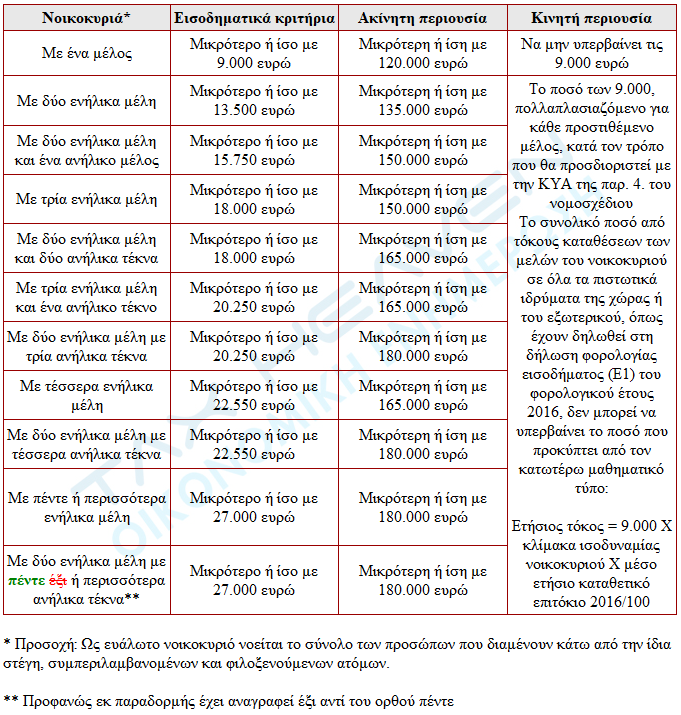 Η συνολική φορολογητέα αξία της ακίνητης περιουσίας όλων των μελών του νοικοκυριού, στην Ελλάδα ή στο εξωτερικό, όπως αυτή προσδιορίζεται για τον υπολογισμό του συμπληρωματικού ΕΝ.Φ.Ι.Α. με τις διατάξεις του ν. 4223/2013 και προκύπτει από την τελευταία εκδοθείσα μέχρι 31.10.2017 πράξη προσδιορισμού φόρου δεν μπορεί να υπερβαίνει στο σύνολό της το ποσό των εκατόν είκοσι χιλιάδων (120.000) ευρώ για νοικοκυριά με ένα μέλος, προσαυξανόμενη κατά 15.000 ευρώ για κάθε πρόσθετο μέλος και έως του ποσού των εκατόν ογδόντα χιλιάδων (180.000) ευρώ.