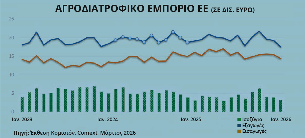 Παρά τη γενικευμένη υποχώρηση των εξαγωγών και των εισαγωγών, ο αγροδιατροφικός τομέας της ΕΕ διατήρησε ισχυρή εμπορική επίδοση τον Ιανουάριο του 2026, επιβεβαιώνοντας τη διαχρονική ανθεκτικότητά του στις διεθνείς αγορές. Σύμφωνα με τα πρόσφατα στοιχεία της μηνιαίας έκθεσης της Κομισιόν, το εμπορικό πλεόνασμα διαμορφώθηκε στα 3,2 δισ. ευρώ, παραμένοντας αυξημένο κατά 4% από τον Ιανουάριο του 2025. Ωστόσο, με βάση τα ίδια στοιχεία, σε σχέση με τον Δεκέμβριο του 2025 καταγράφηκε περιορισμός του πλεονάσματος κατά 17%, γεγονός που αποδίδεται κυρίως στη μείωση των τιμών βασικών προϊόντων.