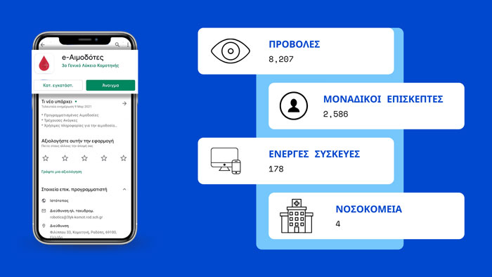 Η εφαρμογή παρέχεται δωρεάν από το Play Store (https://bit.ly/e-aimodotes)» έχει εθελοντικό χαρακτήρα και είναι αφιερωμένη -όπως λένε τα παιδιά- σε άτομα που χρειάζονται μεταγγίσεις αίματος, με την ελπίδα ότι θα νιώσουν ασφάλεια και ανακούφιση, γιατί το μήνυμά τους θα φτάσει άμεσα και έγκαιρα σε όλους.