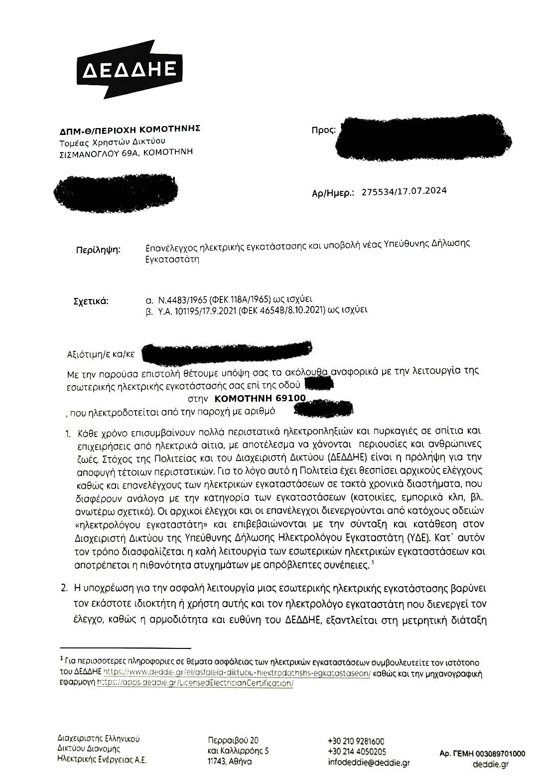 Επανελέγχους από κατόχους αδειών ηλεκτρολόγων εγκαταστάτη με στόχο την καλή λειτουργία των εσωτερικών ηλεκτρικών εγκαταστάσεων και την αποτροπή πιθανότητας ατυχημάτων με απρόβλεπτες συνέπειες ζητά ο ΔΕΔΔΗΕ, σε επιστολές προς αγρότες-χρήστες των εγκαταστάσεων στην Κομοτηνή. Ως αιτιολογία αναγράφονται τα πολλά περιστατικά ηλεκτροπληξιών και πυρκαγιών ετησίως.